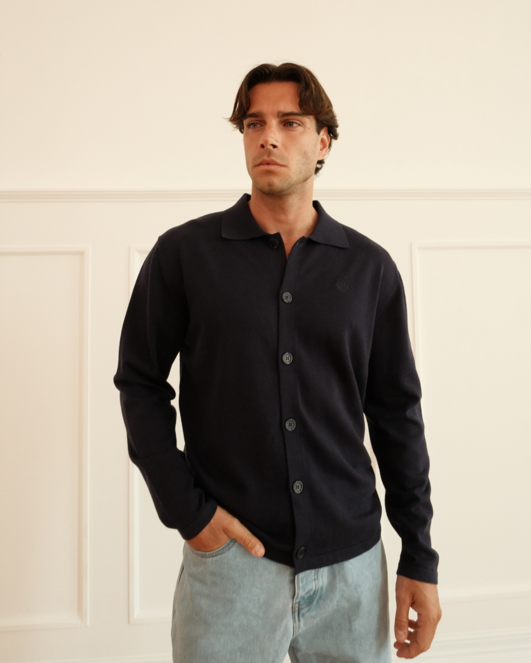 Sleek. Sharp. Effortless. The Navy Milano Knit is your go-to for clean, confident style. With a classic collar, smooth texture, and minimalist design, it’s built to elevate your everyday — from work hours to after-hours.
