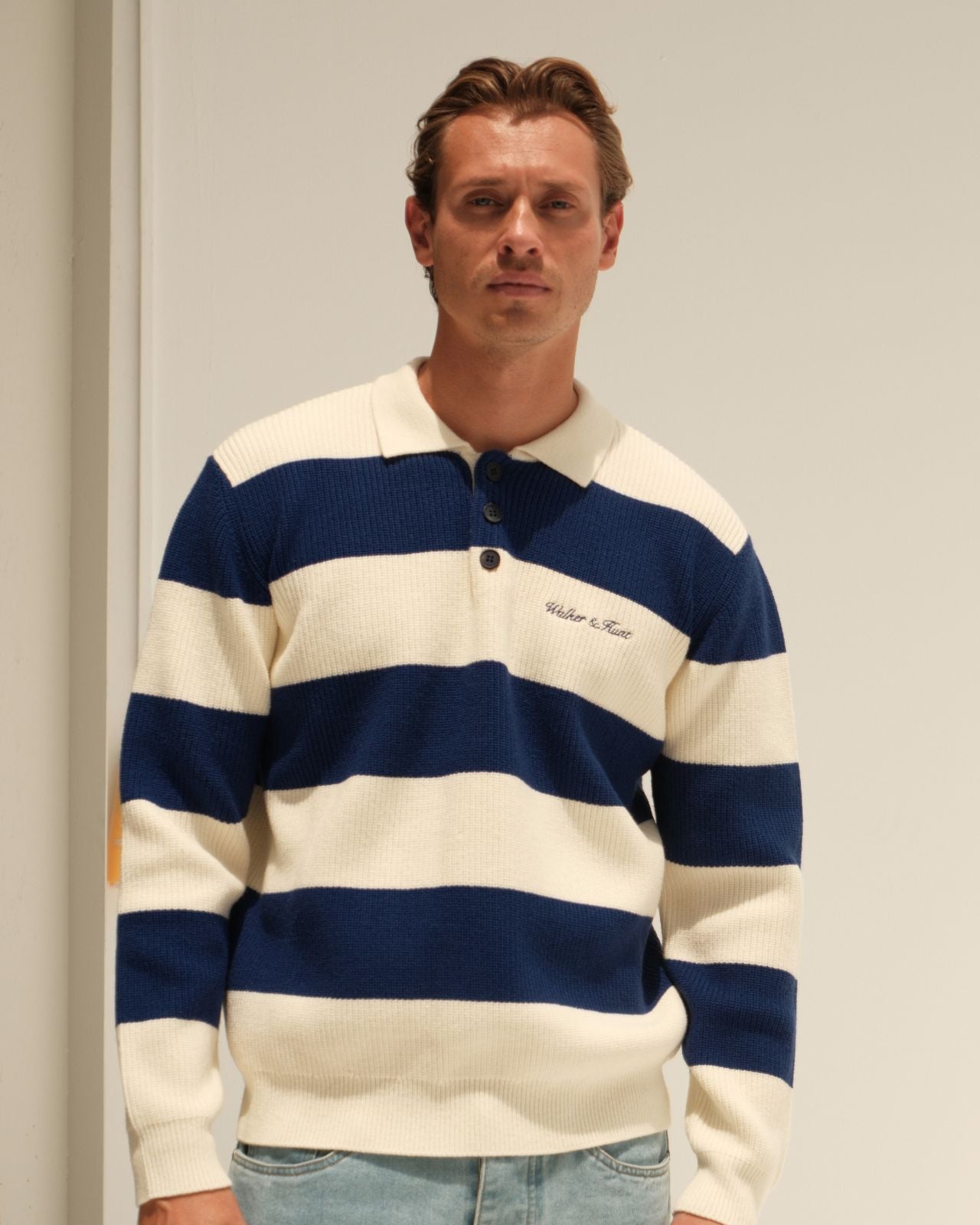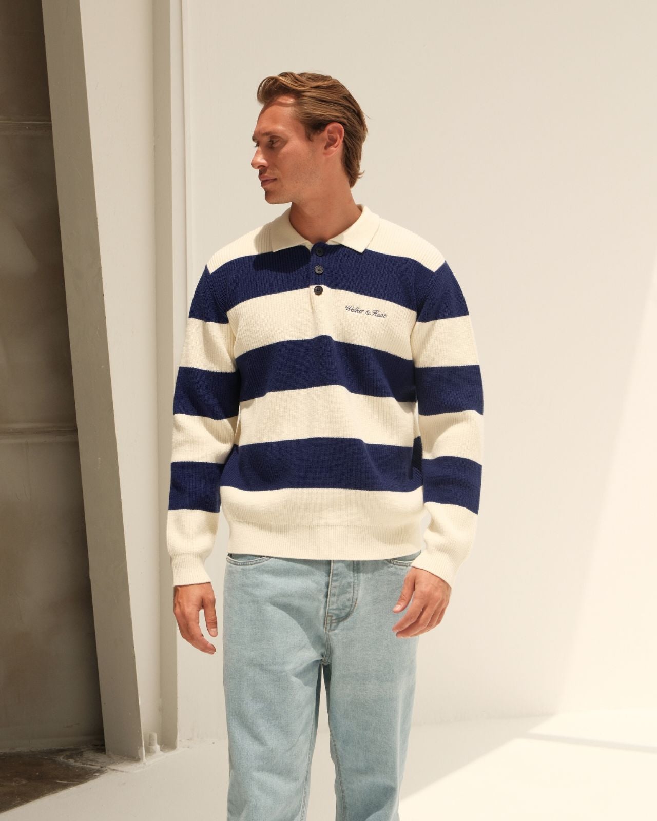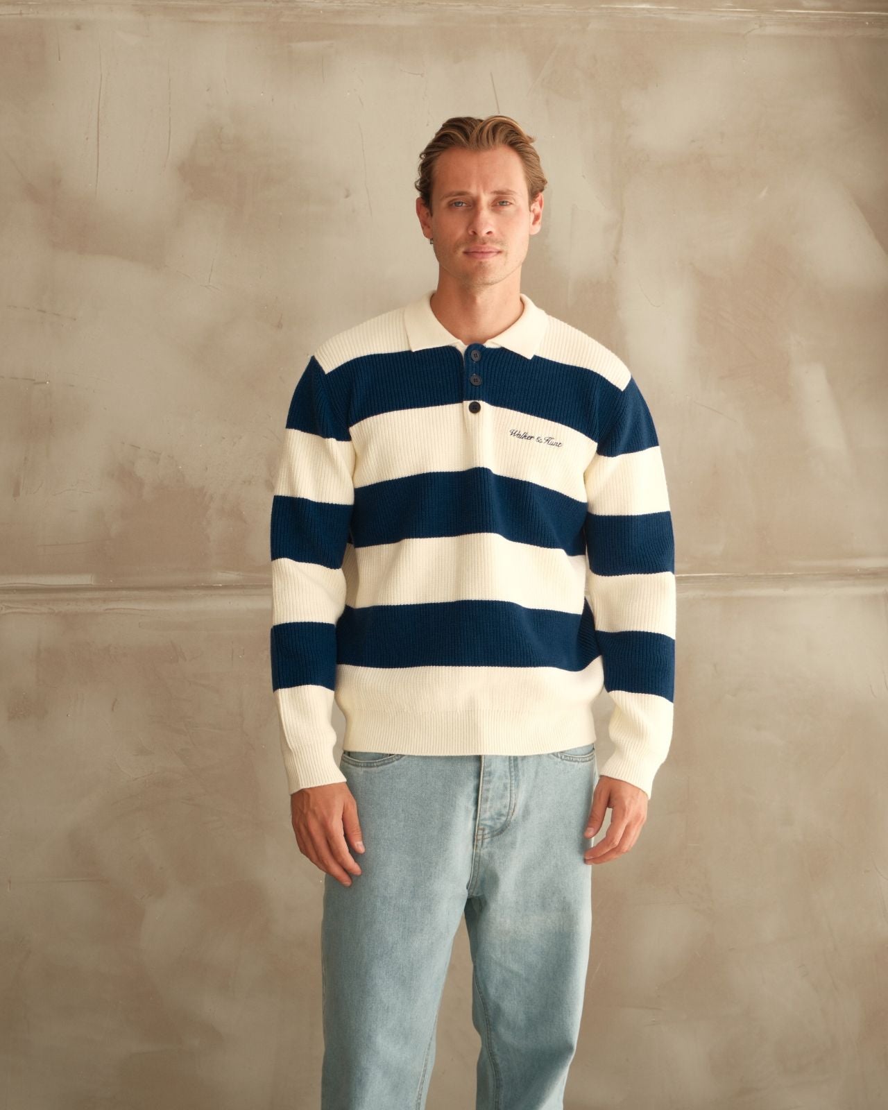 The Lando Knit combines timeless rugby-inspired stripes with a modern edge, making it an essential layer for cooler days. Knitted in heavyweight yarn for warmth and structure, the navy and cream colourway brings a refined yet laid-back aesthetic to your wardrobe.